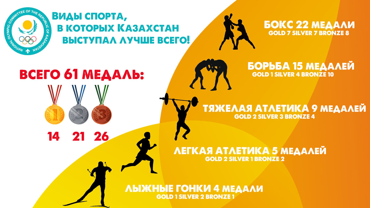 Как отдельная команда, Сборная Казахстана выступает на Олимпийских играх с 1994 года. За 6 летних и 7 зимних соревнований Республика собрала 79 медалей. Однако после допинговых скандалов со сборной были сняты 18 медалей. Сборная Казахстана представлена в разных спортивных дисциплинах, но в некоторых наиболее успешна: Бокс. Команда казахстанских боксеров собрала 22 медали (7 золотых, 7 серебряных и 8 бронзовых). Среди главных призеров - это: Василий Жиров (G), Бекзат Саттарханов (G), Ермахан Ибраимов (G+B), Бахтияр Артаев (G), Бакыт Сарсекбаев (G), Серик Сапиев (G), Данияр Елеусинов (G), Булат Жумадилов (S+S), Мухтархан Дильдабеков (S), Геннадий Головкин (S), Адильбек Ниязымбетов (S+S), Василий Левит (S), Болат Ниязымбетов (B), Серик Елеуов (B), Еркебулан Шыналиев (B), Марина Вольнова (B), Иван Дычко (B+B), Дарига Шакимова (B). Борьба. Вольники и "греко-римляне" принесли в копилку Казахстана 15 медалей (1 золото, 4 серебра и 10 бронзы). Среди победителей - это: Юрий Мельниченко (G), Ис