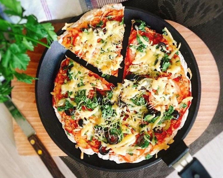 - 5 После этого все посыпаем тертым сыром и накрываем крышкой. Ставим нашу пиццу на плиту. Пиццу готовим на маленьком огне. Готовность пиццы определяется по верхнему слою сыра, он должен хорошенько расплавиться. Низ нашей выпечки должен немного подрумяниться и стать твердоватым.