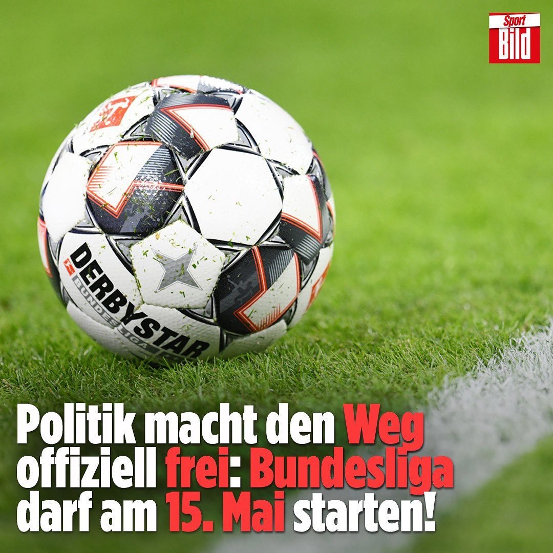Власти Германии одобрили план возобновления Бундеслиги во второй половине мая. Бундеслига станет первым европейским топ-чемпионатом, который возобновится после коронавирусной паузы. Матчи очередного по счету 26-го тура пройдут с 16 по 18 мая. При этом в Германии решили отказаться от традиционно открывающих туры пятничных матчей. Согласно регламенту проведения матчей на стадионе может находиться не более 322 человек (включая футболистов, арбитров, болбоев, представителей аварийных служб и прессы), игроки не будут играть в масках (но все остальные люди в масках должны быть в них, даже запасные), но при этом, естественно, не должно быть зрителей, а игроки должны обходиться без традиционных предматчевых ритуалов (в т. ч. выходов на поле с детьми). ри этом в Германии решили отказаться от традиционно открывающих туры пятничных матчей. Согласно регламенту проведения матчей на стадионе может находиться не более 322 человек (включая футболистов, арбитров, болбоев, представителей аварийных