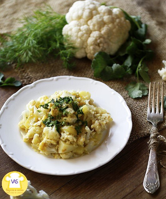 Мелко нарезать лук. Разрежьте цветную капусту на мелкие кусочки и нарежьте картофель кубиками.