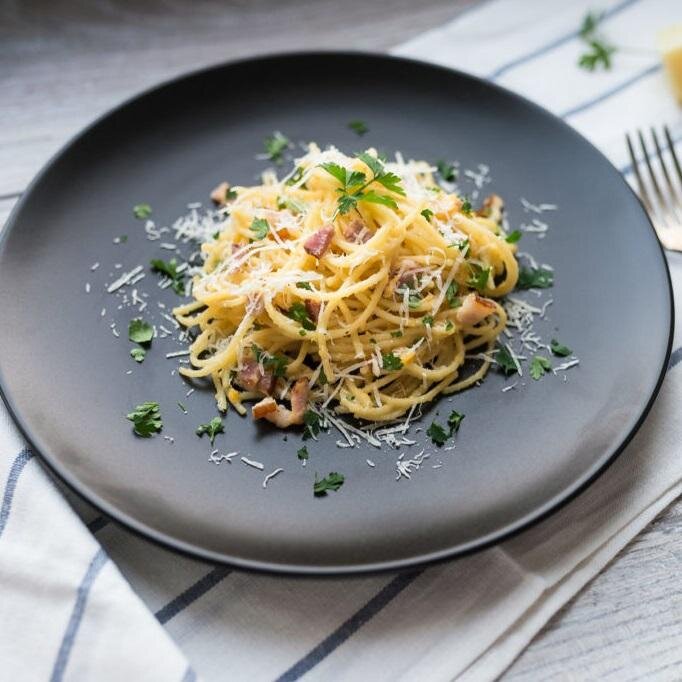 Ингредиенты: Спагетти 250 г Сливочное масло 20 г Чеснок 2 зубчика Красный лук 1 головка Бекон 50 г Сливки 20%-ные 200 мл Тертый сыр пармезан 50 г Яйцо куриное 4 штуки Соль по вкусу Перец черный молотый по вкусу Приготовление: Сварите пасту до состояния аль денте. Пока паста варится, обжарьте на сливочном масле лук, чеснок и мелко нарезанный бекон. В глубокой миске смешиваем яйца и сливки, трем пармезан. Соединяем ингредиенты друг с другом. Приятного аппетита!