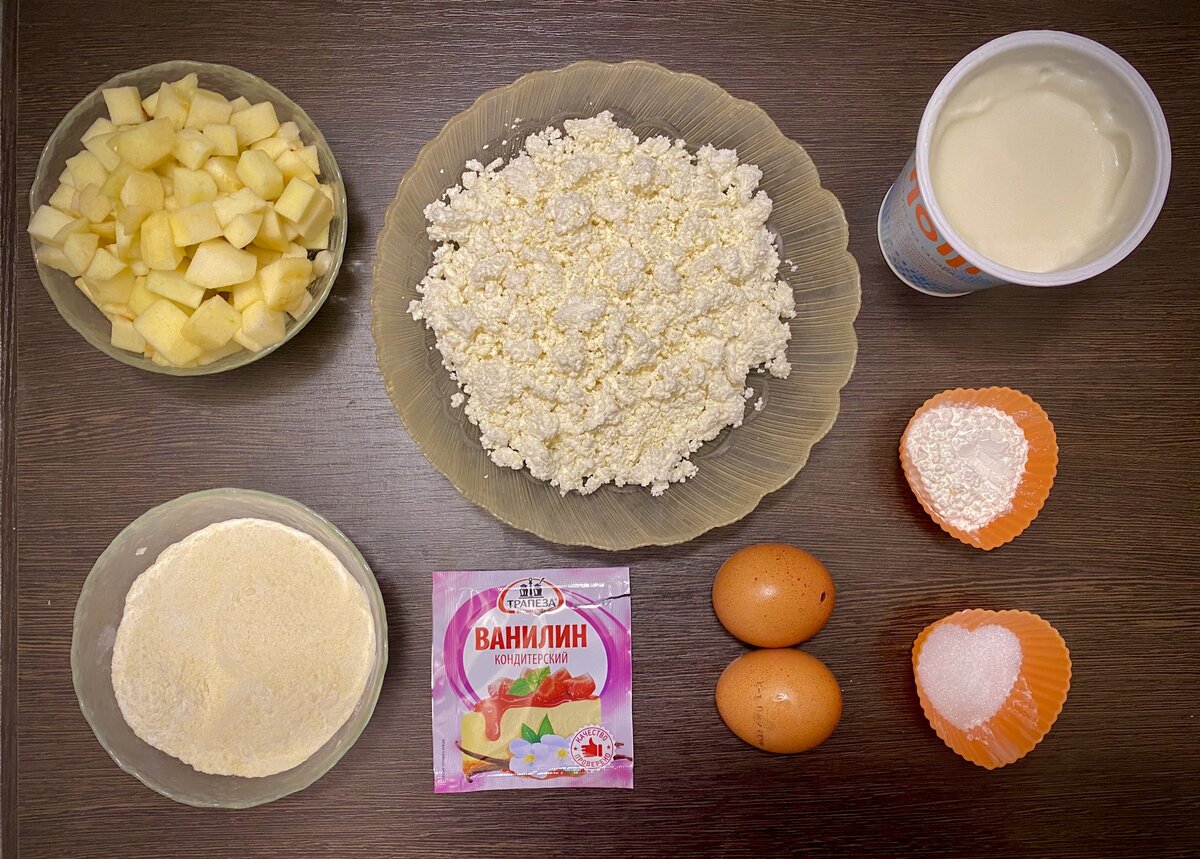 Отдельно порезать яблоки небольшими кубиками. Можно, как в моем случае, сразу добавить яблоки в заливку. Либо сначала выложить яблоки на тесто, а потом залить кремом.