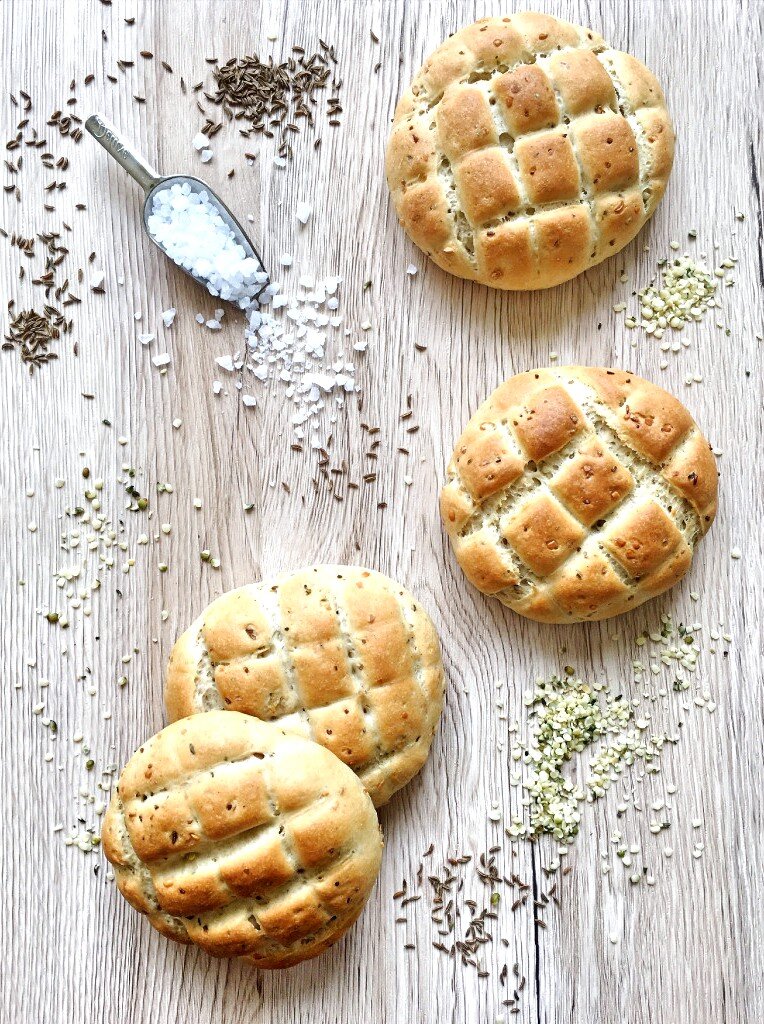 Свежий домашний хлеб в нашей семье обожают все! Кто не любит этот запах, который распространяется по всей квартире, это чувство когда вы откусываете свежий хлеб с хрустящей корочкой. Вы можете попробовать новые сочетания - формы выпечки, другие семена или травы, а сегодня у меня есть для вас рецепт хрустящей пшенично - ржаных булок с конопляными семенами, ароматизированными чесноком. Ингредиенты (10 шт.): для дрожжей: для теста: Сначала приготовьте дрожжи из перечисленных ингредиентов. Смешайте и оставьте на некоторое время в теплом месте. Тем временем во второй миске приготовьте все ингредиенты для теста и добавьте получившиеся дрожжи. Заместите тесто - лучше использовать кухонный комбайн и с помощью крючка это будет сделать гораздо легче! Затем обработанное тесто оставьте подниматься на некоторое время. Поднявшись, разделите на 10 равных частей. Используя ладонь, придайте форму как котлетам и используйте тупую сторону ножа, чтобы сделать надрезы. Переложите приготовленные таким о