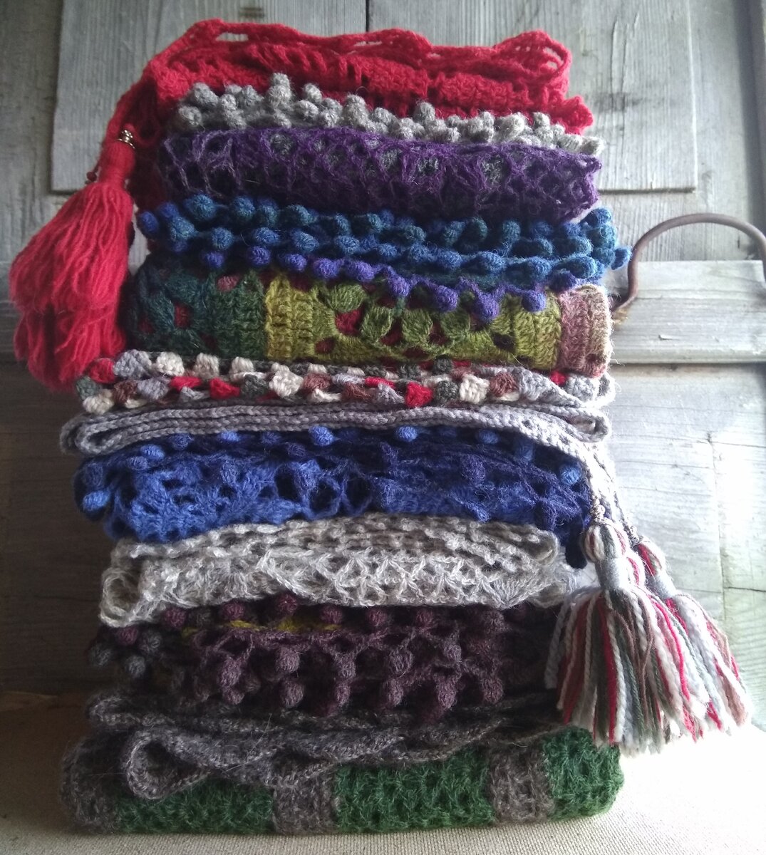 Итак, начинаю знакомить вас с описанием шалей, о которых вы спрашивали в статье, где я рассказываю обо всех связанных мною шалях. И первая шаль, о которой я расскажу - Зеленушечка. Так ласково я называю её сама для себя. Хотя Зеленушечка не первая, связанная по этой схеме шаль. Я расскажу вам сейчас про первую, и вы поймёте, как хороша схема для утилизации остатков. А у меня остались, казалось бы, совсем несочетаемые между собой клубочки Дундаги от двух шалей: Решение объединить остатки в одном изделии было смелым для моего тогдашнего опыта, но то, что получилось в итоге, кажется мне необыкновенно гармоничным по цвету! Благодаря полосатости схемы, вы можете менять цвет либо в каждом ряду, либо в каждом новом блоке, как это сделала я, повторяя схему уже во второй шали. Когда я увидела солид Кауни густого елового цвета (где я покупаю пряжу, рассказываю в этой статье), не смогла удержаться от покупки. Долго вынашивала идею, пока не встретился козий пух привычного нам, шального, цвета. Ко