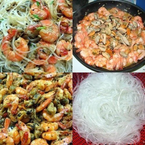 Ингредиенты 100г рисовой (стеклянной) лапши 200г креветок без голов 100г мяса мидии 1 перец чили 2 зубчика чеснока 2 см корня имбиря 1 ч.л. кунжутного масла оливковое масло зеленый лук зелень петрушки кунжутное семя 1/2 лимона соевый соус Способ приготовления 1. Мелко порубить имбирь и чеснок. Слегка обжарить на оливковом масле. Добавить морепродукты и продолжать обжаривать до выпаривания влаги. Если креветки были не варенные то кладем их на сковороду на 3-4 минуты раньше мидий 2. После того как сок от морепродуктов выпарился вливаем на сковороду лимонный сок. Упариваем на 2/3. 3. Снимаем с огня. Добавляем кунжут, кунжутное масло и соевый соус по вкусу. 4. Стеклянную лапшу на 15 минут заливаем кипятком. Воду сливаем. 5. Смешиваем лапшу и морепродукты. Даем постоять. Украшаем зеленью.