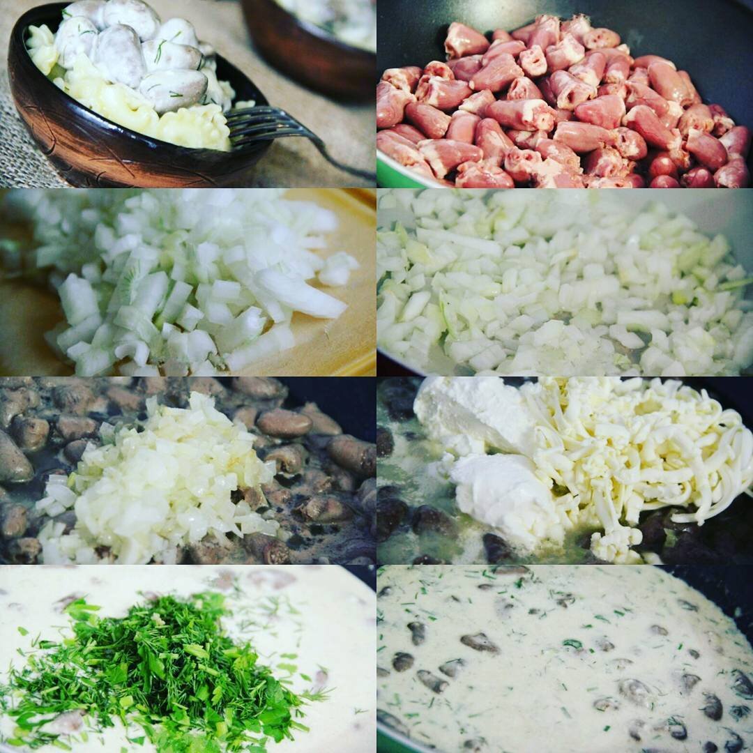 6.Добавить в сковороду к куриным сердечкам сметану и сыр, перемешать. Сыр расплавится и наш соус станет однородным. Добавить в сковороду крахмал, чеснок и зелень.