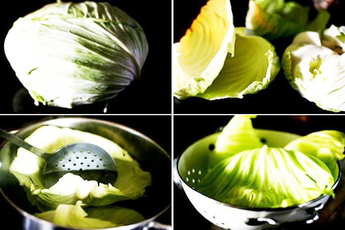 Как приготовить Голубцы с мясом, рисом и зеленью Пошаговый рецепт 1. В миске смешать все ингредиенты для начинки, тщательно вымесить. Отложить в сторону. Подготовить капустные листья. Наполнить большую кастрюлю с водой, добавить щедрую щепотку соли и довести до кипения. Острым ножом вырезать ядро капусты и аккуратно снять листья, сохраняя их целыми и неповрежденными. Погрузить листья в кипящую воду несколькими партиями и бланшировать их в течение 5 минут, пока они чуть смягчатся и станут податливыми. Вытащить листья, переложив их в дуршлаг. Повторить процедуру с оставшимися листьями. 2. Когда листья немного остынут, ножом срезать грубую центральную часть листьев (вырезать формой V). Если листья большие, можно просто разрезать их пополам. В центр листа выложить начинку. Завернуть лист в конверт. Голубцы выложить близко друг к другу на дно кастрюли швом вниз, делая несколько слоев. Если у вас получается несколько слоев, смажьте между слоями томатной пастой. 3. Томатную пасту растворить