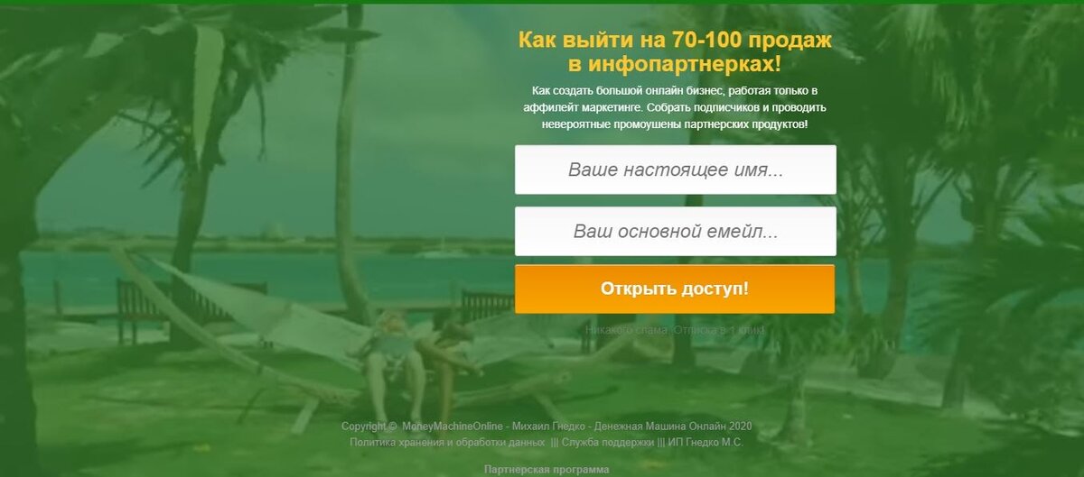 Михаил Гнедко — автор нескольких курсов по заработку. Его уроки построены на том, как научиться зарабатывать в интернете с минимальными вложениями. Мастер-классы ориентированы на всех. Не имеет значения образование и опыт работы. Достаточно пройти обучение, чтобы зарабатывать от 1000 долларов в неделю. Рассмотрим один из курсов Михаила Гнедко «Денежная машина онлайн» и выясним, стоит ли тратить на него деньги. Разоблачение Михаила Гнедко Михаил Гнедко публикует информацию о своих программах на сайта и в социальных сетях. При этом он скрывает свое лицо, что уже вызывает сомнения в его добросовестности. При входе на сайт можно увидеть приглашение на обучение в формате вебинара, где автор будет рассказывать о создании собственного инфобизнеса и заработке первой тысячи долларов уже через 2 недели. Контакты: Бесплатный вебинар создан с целью продажи курсов. Чтобы получить к нему доступ, необходимо заполнить небольшую форму для регистрации. Сразу после ввода данных открывается доступ к лично