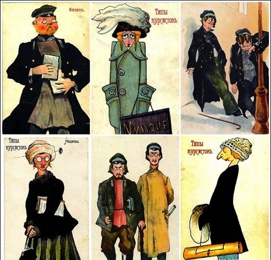В начале 20 века в Москве и Петербурге в студенческой среде считалось очень модным дарить друг другу карикатурные открытки, на которых были с юмором изображены студенты, гимназисты, курсистки в анфас и в профиль.