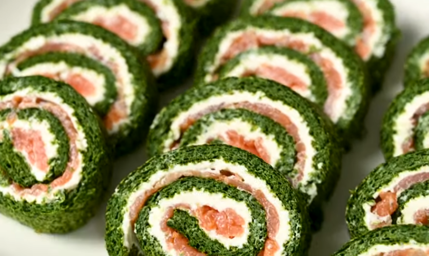 Эта закуска невероятно смотрится на праздничном столе. Вы сможете удивить своих гостей приготовив ее. Для ее приготовления потребуется минимальный набор ингредиентов и немного времени. При приготовлении рулета с основами можно поэкспериментировать. Попробуйте вместо шпината использовать свеклу или морковь. А если вы сделаете все три вида рулета, то на столе они будут выглядеть просто потрясающе. Обязательно попробуйте! Итак приступим... К сожалению свежего шпината мне найти не удалось и я использовала замороженный. Откинула шпинат на сито, дала стечь излишкам воды. После чего дополнительно его еще и отжала. Затем отделяем белки от желтков. При помощи блендера превращаем шпинат и желтки в однородную массу. Отдельно взбиваем белки. Для того, чтобы масса хорошенько взбилась, добавьте в нее немного соли. В белки добавляем шпинатно-желтковую смесь и тщательно перемешиваем до получения однородной консистенции. В результате у нас получается шпинатный бисквит. Полученную массу выкладываем на