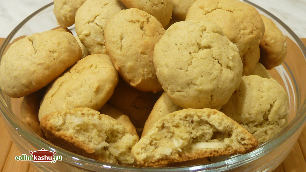 сода — 1/2 ч. л. Эта статья о мягких, рассыпчатых и вкусных кокосовых печеньях. Основные ингредиенты в этом рецепте: мука, яйца, сахар, сливочное масло и кокосовая стружка. Муку в выпечке я часто комбинирую. Для этих печений я взяла пшеничную цельнозерновую, овсяную и рисовую по 100 гр. Но подойдет и обычная пшеничная мука. Я её просеяла. Добавлю соду и немного соли. Сухие ингредиенты перемешаю. В сливочное масло комнатной температуры добавлю сахар, перетру, разобью два яйца и снова перемещаю. К получившейся массе присоединю кокосовую стружку. Я её делала сама из свежего кокоса. Настало время добавлять муку. Если вы будете использовать покупную кокосовую стружку, то муки может понадобиться меньше, так как эта стружка более сухая. Поэтому лучше начать с 200 гр муки, а затем добавляются по мере необходимости, наблюдая за тем, какой консистенции получается тесто. Оно должно быть мягким, но не липнуть к рукам. Из получившегося теста можно сразу делать печенье. А можно приготовить ег