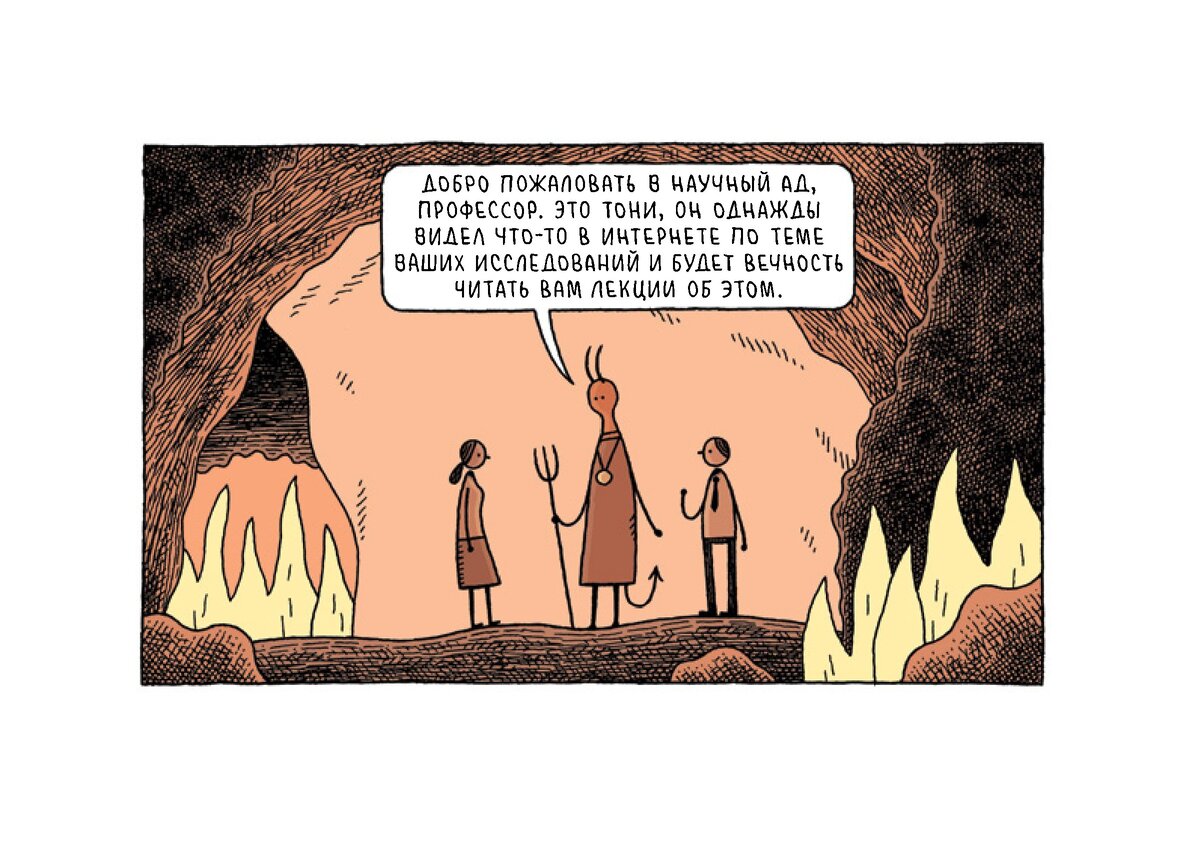 Среди ваших знакомых есть ученые? А может, вы сами занимаетесь наукой? В таком случае вы определенно найдете что-то близкое в забавных комиксах Тома Голда! Если вы не знали, как выглядит ад для ученых, то вот он! Людям науки тоже нужны мотиваторы, только более конкретные... Большинство открыток, которые ученые получают от своих далеких от науки друзей, выглядят именно так: Порой всем нам нужно больше фиолетовых коробок. И голубых тоже... Если вы не понимаете, что делаете, не корите себя. Вполне вероятно, вы в этом не одиноки: Еще больше забавных научных комиксов можно найти на страницах нашей весенней бумновинки — сборника британского иллюстратора Тома Голда «Факультет выноса мозга». В предыдущих книгах, «Вы просто завидуете моему реактивному ранцу» и «Готовим с Кафкой», Том шутил над классиками, читателями и библиотекарями. На этот раз жертвами его искрометного юмора оказались ученые, нанороботы и современные научные теории. Эти и другие книги британца с идеальным чувством