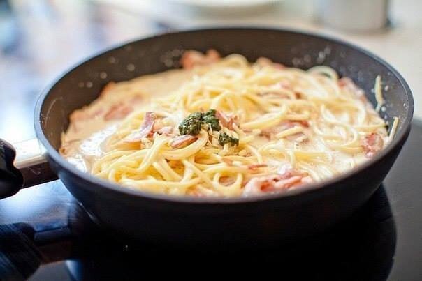 6. Добавьте спагетти в получившийся соус и прогрейте, помешивая, на небольшом огне в течение 30 секунд.