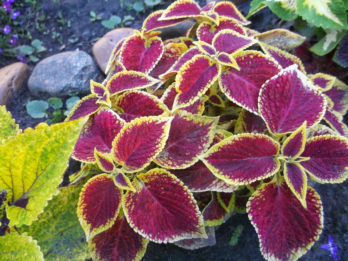 Колеус-род растений семейства яснотковые, насчитывает около 150 видов растений. Листья колеуса окрашены в различные сочетания зелёного, жёлтого, бордового, красного цветов. Листья сердцевидные, супротивные. Стебель ребристый. Цветы мелкие лиливого или голубого цвета собраны в колосовидное соцветие. Особой ценности не представляют, ценятся за красоту листьев. Цветы некоторых сортов имеют приятный аромат. В выращивании прост, солнцелюбив. Растёт на любой окультуренной почве. Чаще всего размножают черенками в марте или семенами, которые очень мелкие. Сеют их поверхностно в марте-апреле. При недостаточном освещении рассада вытягивается и ослабевает.Когда рассада вырастет до 4 см её прищипывают, также прищипывают и боковые побеги, тогда колеус будет хорошо куститься. Можно выращивать как комнатное растение, а можно в цветниках открытого грунта. Можно даже составить композицию из колеусов разной окраски. Содержание. Старайтесь держать колеусы на самых освещённых подоконниках, а зимой при т