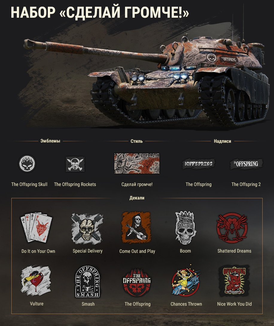 Наше сотрудничество стало удивительным опытом как для The Offspring, так и для нашей команды. Посовещавшись с участниками группы, мы решили дать возможность каждому игроку украсить любимые танки (любого уровня и нации) новым стилем «Сделай громче!», вдохновлённым The Offspring. Стиль включает в себя: