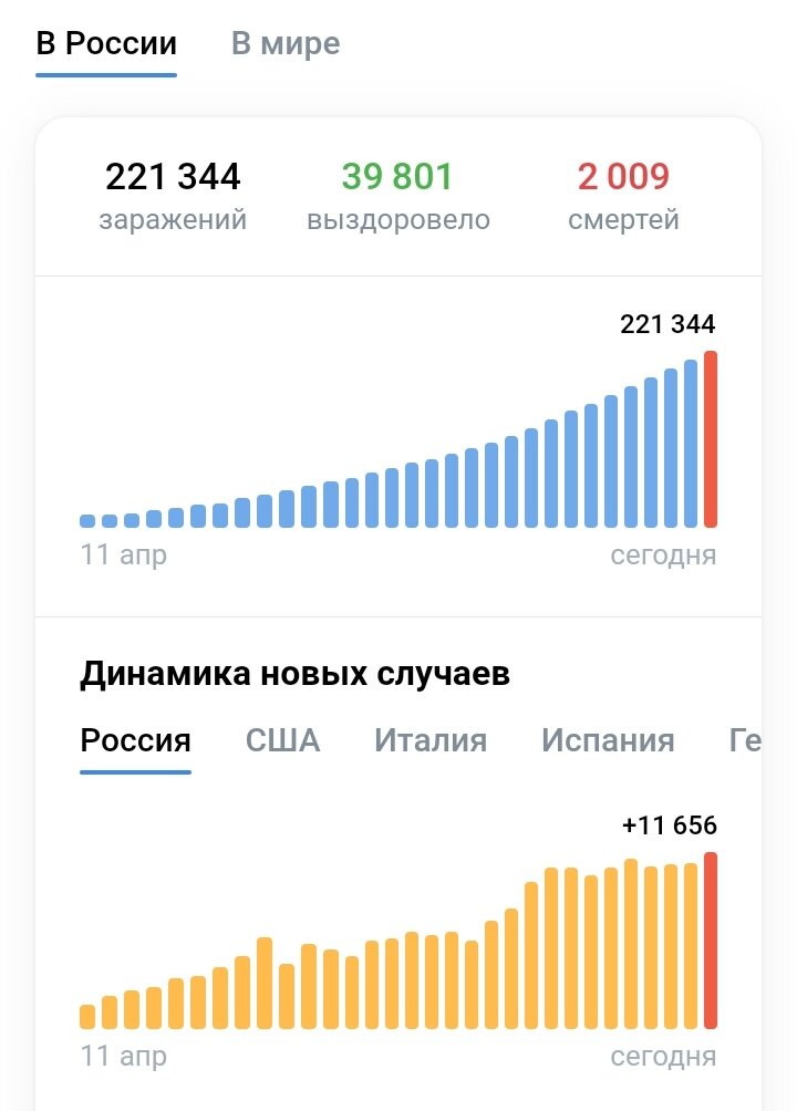 Новых случаев заражений становится все больше: неудивительно. Я живу в регионе и, к сожалению, никаких условий самоизоляции большинство людей не соблюдает. Но в регионах темпов роста заболевших не такие большие, почему? Как многие говорят, очень часто вирус протекает бессимптомно, а в регионах тестировать абсолютно всех никто не собирается. Отсюда и маленькие темпы роста, что не скажешь о Москве и Московской области, в которых режимы самоизоляции очень строгие, и казалось бы, там ситуация должна быть противоположной, но там делают тесты абсолютно всем, отсюда и большое количество заболевших каждый день. Загадкой остаётся Санкт-Петербург, неужели в городе с таким огромным населением, темпы роста заболевших такие же, как в Нижегородской области? Как такое может быть, мне лично не понятно, нет тестов или скрывают реальную информацию - не знаю.