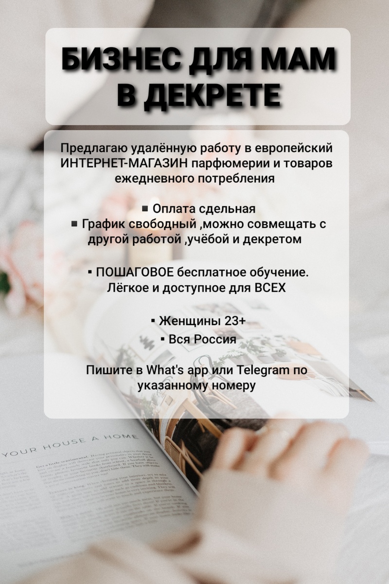 Предлагаю удалённую работу в европейский ИНТЕРНЕТ-МАГАЗИН парфюмерии и товаров ежедневного потребления ▪Оплата сдельная ▪График свободный ,можно совмещать с другой работой ,учёбой и декретом ▪︎ПОШАГОВОЕ бесплатное обучение. Лёгкое и доступное для ВСЕХ ▪︎Женщины 23+ ▪︎Вся Россия Пишите в What's app или Telegram по указанному номеру 89046577899