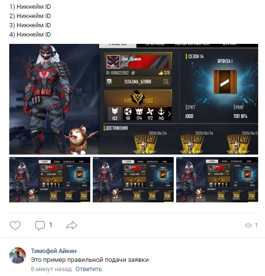 (Никнейм+ID+Скриншот всех четверых)