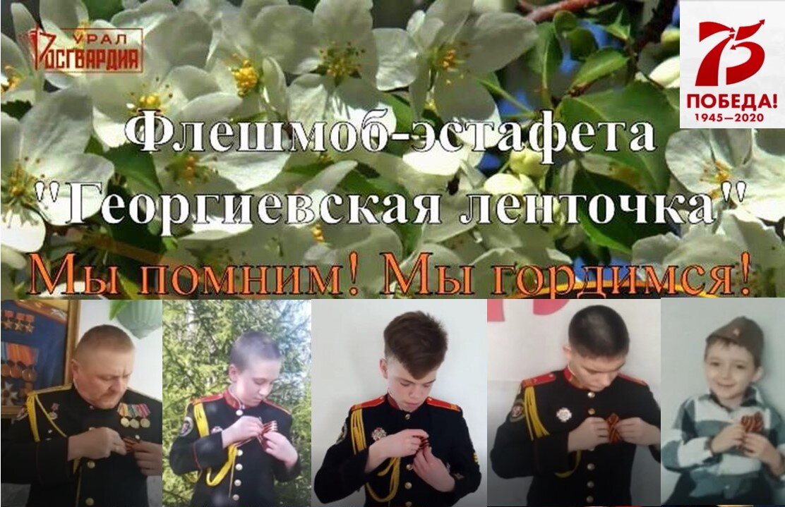 Сотни участников из разных регионов страны подержали патриотическую флешмоб-эстафету Уральского округа войск национальной гвардии Российской Федерации «Георгиевская ленточка», которая прошла в онлайн-формате на официальных сайтах и в социальных сетях округа, атакже территориальных управлений. К акции присоединились военнослужащие и сотрудники ведомства из других оперативно-территориальных объединений, ветераны, кадеты различных учебных учреждений, взрослые и дети.