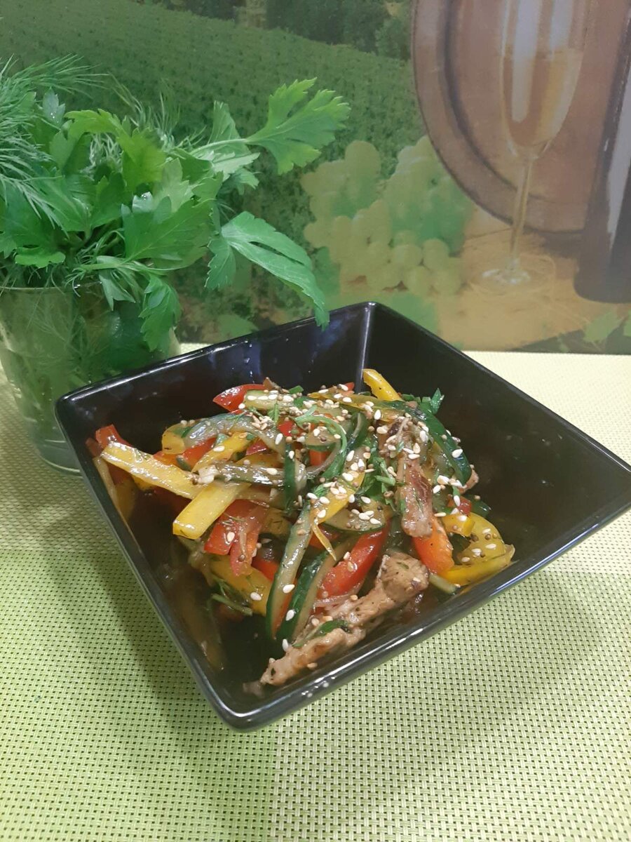 Очень люблю салаты с болгарским перцем, мясом и соевым соусом. И вот получился такой салатик. Нам понадобится: Перец болгарский - 2 шт. (лучше разного цвета). Огурец - 2 - 3 шт. (зависит от размера). Морковь - 1 шт. (можно добавить морковь по- корейски ). Лук репчатый - 1 шт. Мясо свинина или говядина - 500 гр. (примерно). Зелень Чеснок - 4 -5 зуб. Перец красный молотый - по вкусу. Семена кунжута и горчицы - по 1 чайной ложке. Имбирь маринованный - 20 гр. Соевый соус масло оливковое (можно и подсолнечное). Огурцы нарезаем соломкой , но с начала нужно удалить семена .Если этого не сделать, будет много сока. Переложить в чашку , добавить чеснок , соевый соус и острый перец. Пусть маринуются. Перец нарезаем соломкой и соединяем с огурчиками. Морковь натираем на терке для корейских салатов, чуть-чуть посолить и перемешать. Когда морковь даст сок , слегка отжать и обжарить на сковороде. Мясо и лук нарезаем соломкой. Разогреваем сковороду. И