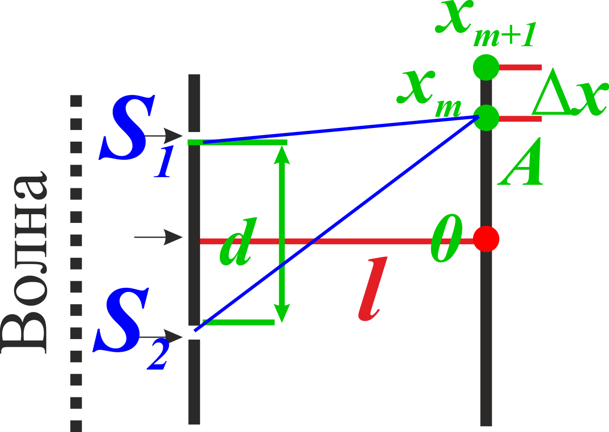 Расстояние между когерентными источниками света d=0.5 мм, расстояние от источников до экрана l=5 м. В зелёном свете получились интерференционные полосы на расстоянии Δx=5 мм друг от друга. Найдите длину волны зелёного цвета. // Ремизов А.Н., Максина А.Г. "Сборник задач...", 2001 г. https://bookmix.ru/bookprice.phtml?id=84492 Рисунок 1. Расстояние между полосами рассчитывается как разница координат центров полос - x_m и x_(m+1). Вывод рабочей формулы можно посмотреть в Задаче 5.12.