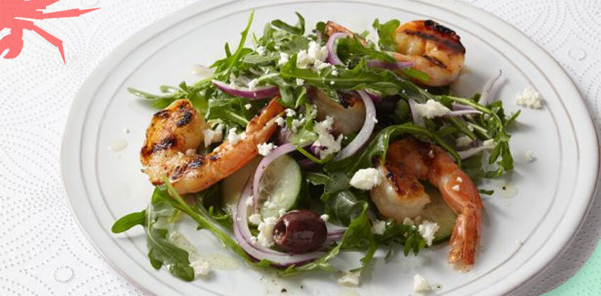 - 230 г сыра фета Берем огурец и нарезаем мелкими ломтика. Должны получить 1 стакан или 240 г нарезанного огурца. Тоже делаем с красным луком: нарезаем тонкими колечками. Лука должно получиться 60 г или ¼ стакана. Разогреваем сковороду, слегка смазанную маслом. Выкладываем креветки, солим и перчим их. Обжариваем с каждой стороны по 2-3 минуты. Если есть гриль, то можно приготовить креветки на гриле. Приготовим заправку, для этого смешаем лимонный сок, оливковое масло, соль, перец. Берем глубокую миску, смешиваем креветки, рукколу, оливки, огурцы и лук. Сверху поливаем заправкой, еще раз хорошо перемешиваем и посыпаем сором фета. Салат готов. Приятного аппетита! Источник: https://wildcrab.ru/news?id=560