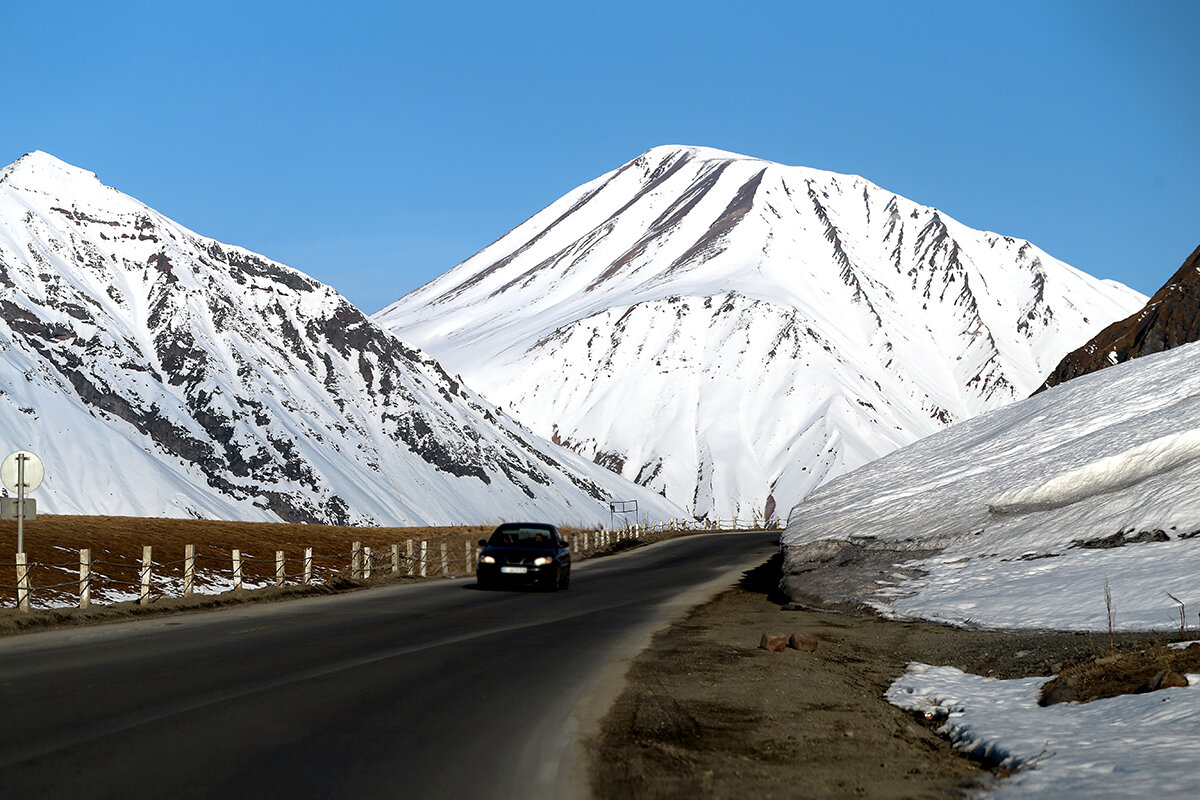Военно-Грузинская дорога невероятно живописные место, которое таит в себе множество опасностей. Это дорога проходит через Главный Кавказский Хребет, и соединяет Россию с Грузией. Мы отправились рано утром из Владикавказа до границы с Грузией. Сразу увидели поток грузовиков по правой стороне. Он был нескончаемый. Нам оставалась очень узкая дорожка для езды. Но граница была совсем рядом. Мы прошли её очень быстро. И ура, какое-то время ехали по довольно хорошей дороге! Сразу после границы стоит прекрасный храм, а потом невероятные виды гор и ущелий. Сказочное Казбеги, утопающее в облаках. Казбеги (Степанцминда) – посёлок в горах, где стоит священный храм святой Троицы Гергети на высоте 2170 метров у подножия горы тысячника Казбека. Гора самая высокая на Кавказе. Внизу протекает речка Терек. Виды невероятные. Там чувствуешь полёт, а себя маленькой песчинкой во Вселенной. Дальше дорога сужается и почти невозможно ехать. Стоят сплошные фуры и грузовики, а некоторые почти закрывают прое