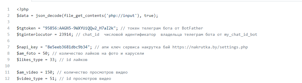 Подготовка (все собранные в следующих пунктах данные рекомендую сохранить в заметке/файле или как будет удобно) Немного правок в коде и webhook telegram Результат Ваш личный телеграм-бот помощник готов к работе. Автоматически распознаёт ссылки на инстаграм посты, накручивает на них или лайки, или просмотры (в зависимости от типа поста)