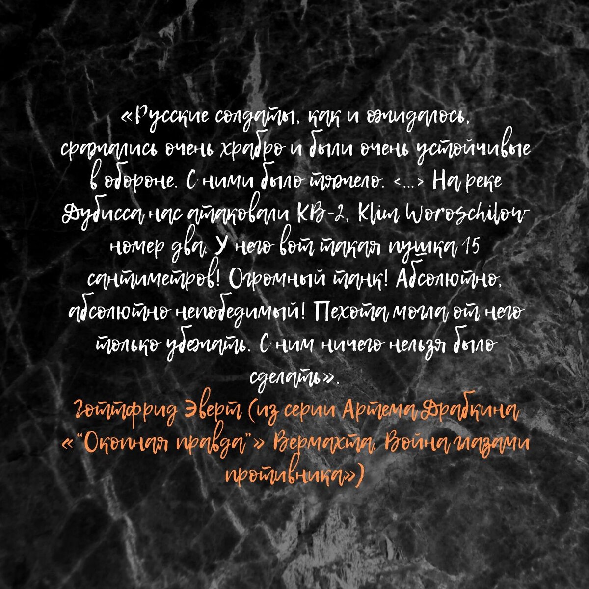 Готтфрид Эверт (из серии Артема Драбкина «“Окопная правда”» Вермахта. Война глазами противника»): «Русские солдаты, как и ожидалось, сражались очень храбро и были очень устойчивые в обороне. С ними было тяжело. <…> На реке Дубисса нас атаковали КВ-2, Klim Woroschilow номер два. У него вот такая пушка 15 сантиметров! Огромный танк! Абсолютно, абсолютно непобедимый! Пехота могла от него только убежать. С ним ничего нельзя было сделать».