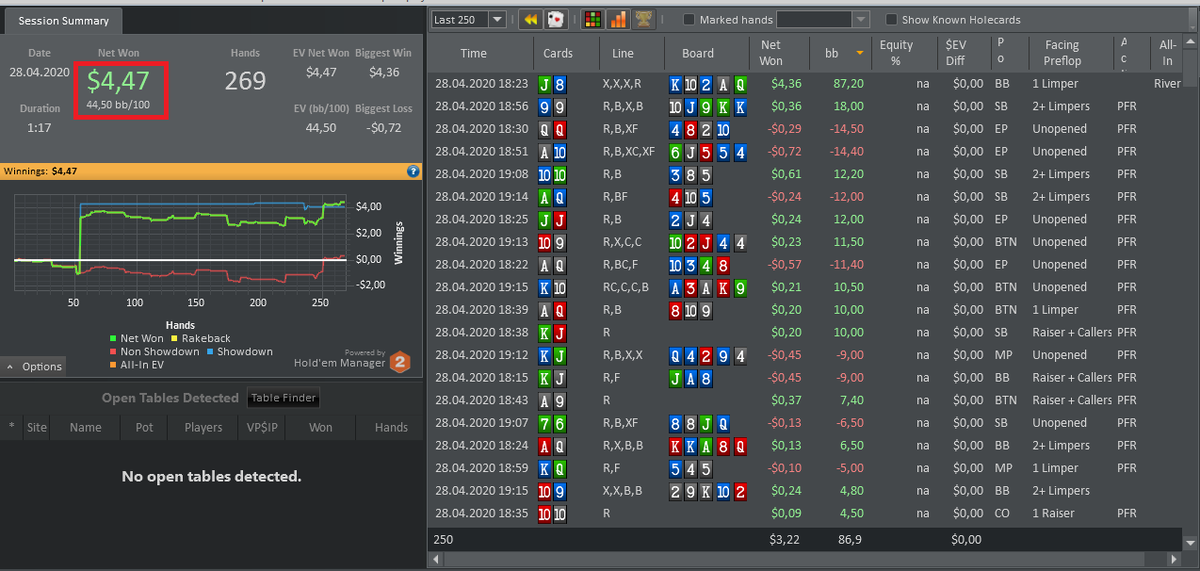 Всем привет (ну как всем, тем кто зашел в эту статью, если вообще хоть кто нибудь зашел). О том, почему я начал играть в покер я написал в этой статье: Решил стать покерным игроком, как в крутых голливудских фильмах. Для достижения этой цели нужно играть чаще и побеждать постоянно. Я начал с 10$. Сейчас мне нужно как минимум 100$, чтобы перейти на лимит вышел. Пока я играю самый маленький лимит и выиграть там хоть что-то серьезное нереально. За сессию 28.04 я смог увеличить свой "банк" больше чем на 4$. Спасибо одному парню из этой раздачи: Мы все улицы чекали друг в друга. Я был на большом блайнде и мне было как-то параллельно на банк, но ривер всё поменял. И каким-то непонятным мне чудом, этот "бедняга" решил поставить в меня all-in. Я просто нажал call. Был и неприятный проигрыш: Я пытался блефовать и выдавить соперника из банка, но он колил меня 2 улицы и в итоге, на ривере я выбросил на его ставку. Я провел за игрой почти полтора часа и меня радует что я хорошо играю на пост-