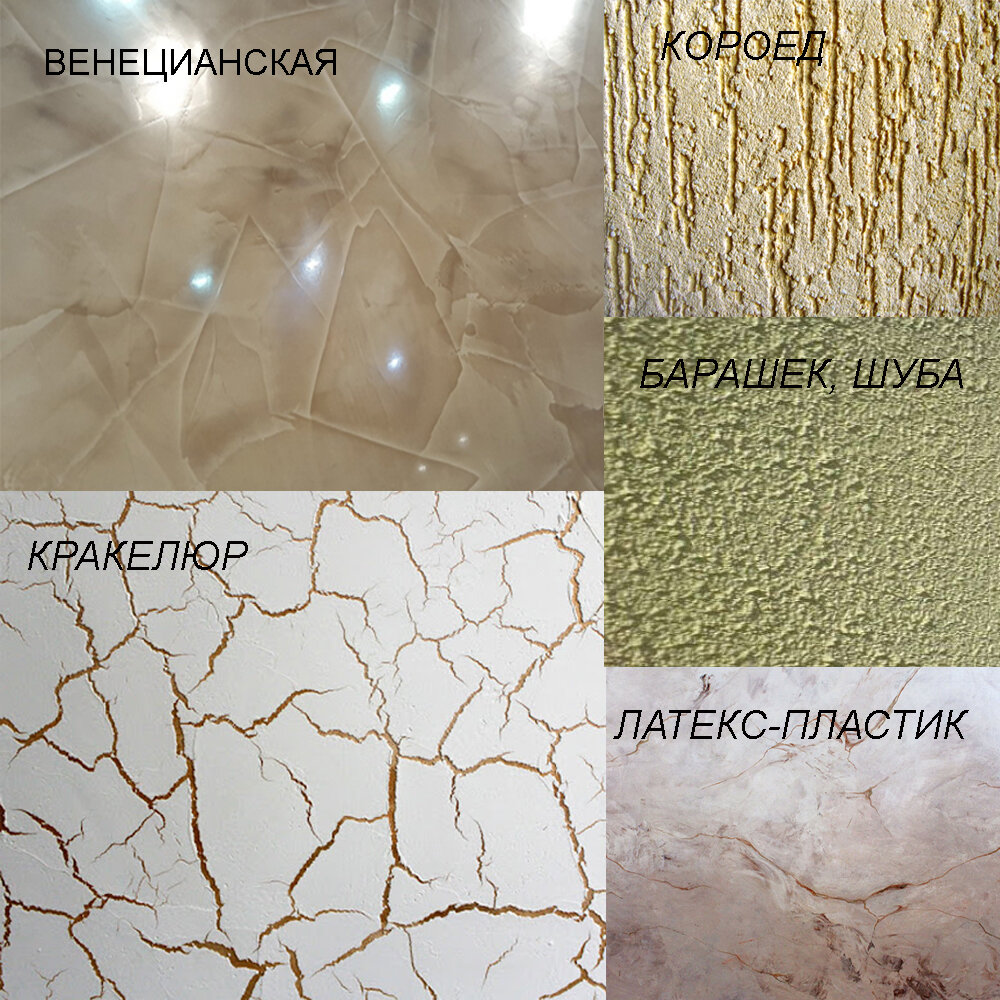 ВЕНЕЦИАНСКАЯ - покрытие имитирует мрамор, оникс. Эта работа непростая и требует сноровки. КОРОЕД - готовая поверхность напоминает дерево, изъеденное жуками-древоточцами. В зависимости от техники нанесения, бороздки могут быть расположены вертикально, горизонтально или по кругу. БАРАШЕК, ШУБА - поверхность равномерная, зернистая или в виде ворсинок. КРАКЕЛЮР - создается необычный эффект растресканной, состаренной поверхности. ЛАТЕКС-ПЛАСТИК - гладкая, немного глянцевая фактура, имитирующая мрамор или другой камень. Рисунок получают с помощью колеровки.