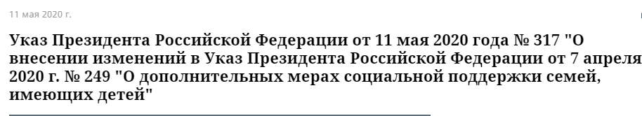 11 мая Президент Рф дополнительно перечислил меры которые направлены на поддержку населения. Данные меры были внесены Указом Президента Российской Федерации от 11 мая 2020 года № 317 "О внесении изменений в Указ Президента Российской Федерации от 7 апреля 2020 г. № 249 "О дополнительных мерах социальной поддержки семей, имеющих детей". Какие выплаты семьям с детьми будут произведены и кому положены? 1- гражданам РФ , у которых имеется право на материнский капитал, согласно ФЗ от 29 декабря 2006 г. № 256-ФЗ "О дополнительных мерах государственной поддержки семей, имеющих детей"- получат 5000 рублей ежемесячно с апреля по июнь. 2- гражданам Российской Федерации, проживающим на территории Российской Федерации, у которых первый ребенок родился или которыми первый ребенок был усыновлен в период с 1 апреля 2017 г. по 1 января 2020 г.- 5000 рублей ежемесячно с апреля по июнь. 3- с 1 июня 2020 г. единовременную выплату в размере 10 000 рублей гражданам Российской Федерации, проживающим на
