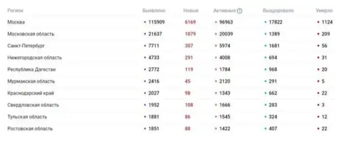 На момент публикации этой новости (11 мая, 12:09 мск) в России было официально объявлено о 221 344 случаях заболевания коронавирусом COVID-19 (в 85 регионах). Выздоровели уже 39 801 человек. Официально зарегистрировано 2009 летальных исходов. Наибольшее количество зараженных — в Москве (115 909), Московской области (21 637), Санкт-Петербурге (7711), Нижегородской области (4733), Республике Дагестан (2772), Мурманской области (2416), Краснодарском крае (2027), Свердловской области (1952), Тульской области (1881) и Ростовской области (1851). За последние сутки в России было зафиксировано 11 656 случаев заболевания коронавирусом в 84 регионах. Что касается общемировой статистики, то, по данным Worldometers, коронавирус распространился уже на 212 стран и территорий. В общей сложности было зафиксировано 4 196 784 случая заболевания коронавирусом. Умерли 284 034 человека, выздоровели — 1 500 385. Наибольшее количество случаев коронавируса было зафиксировано в США (1 367 963), Испании (264 66