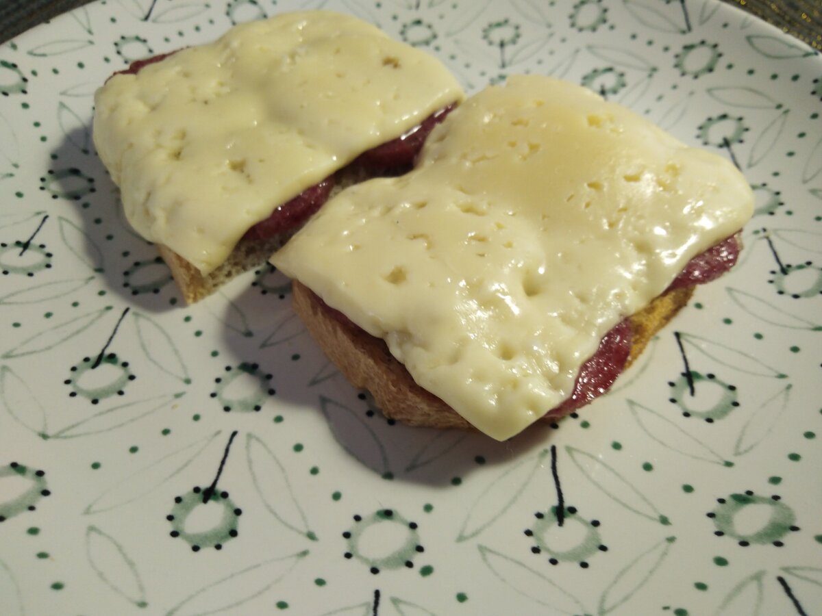 Берем: Колбасу сырокопченую (салями, полукопченую) Сыр жирный (типа «Российский») Хлеб Режу хлеб: толщина среза 1-1,5 см, не толще. Хлебный срез разрезаю поперек на половинки. Колбасу нарезаю колечками не тоньше 3 мм, иначе просто не будет чувствоваться. Сыр режу пластами чуть толще колбасы, размером – чтобы накрывал хлеб, но не свешивался сильно, иначе просто стечет. Дальше все просто: колбасу кладу на хлеб – по 4 кружка на каждую половинку хлебного среза, сыр поверх колбасы. Если есть желание, присыпаю сыр сушеной зеленью – обычно кинзой или орегано, или укропом. В микроволновку! Духовкой с утра не пользуюсь – нет времени разогревать. Включаю микроволновку на среднюю температуру и не отхожу – сейчас главное не «просахатить» момент, когда сыр набух и размяк, но еще не запузырился – не нужно его «кипятить», невкусно будет. Иногда сдабриваю готовые бутеры щепоткой перца. И вам приятного аппетита! Ешьте на здоровье и для удовольствия. И добавляйтесь, будем готовить вместе.