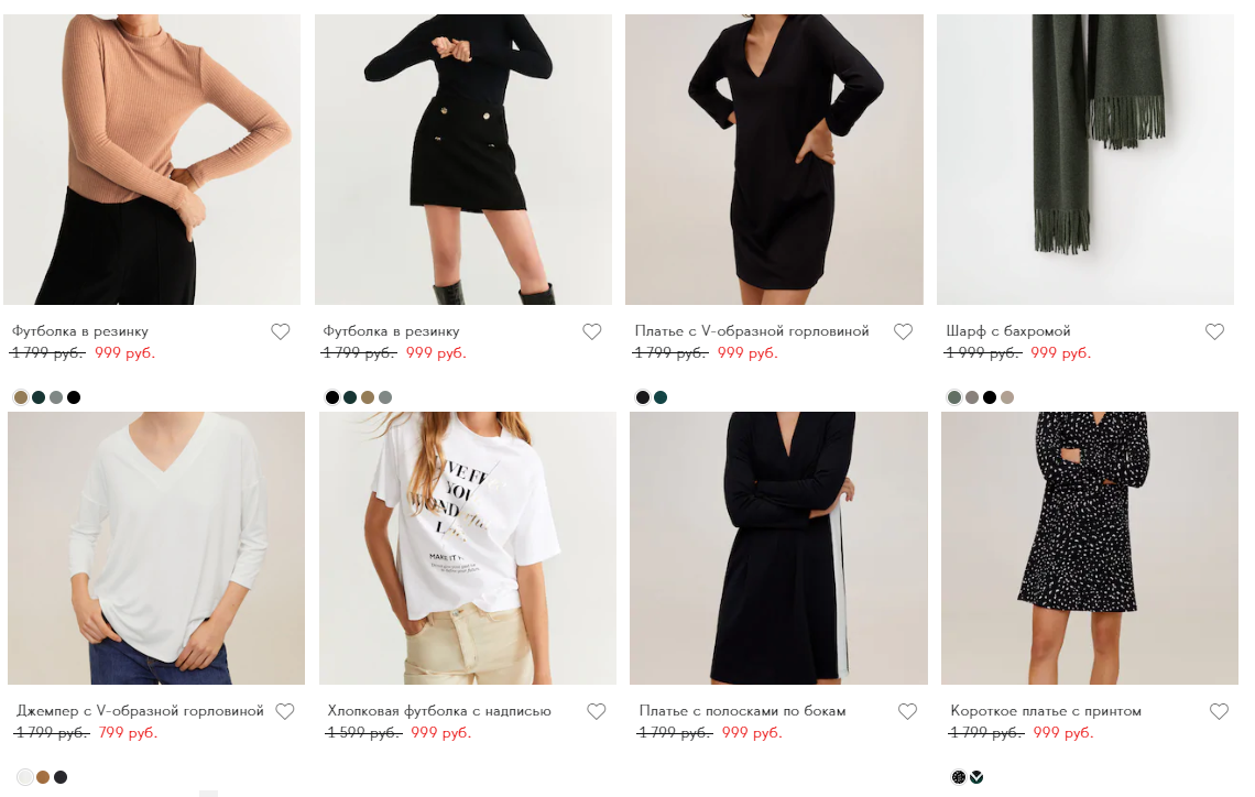 А вот за 799 рублей есть джемперы, что уже актуальней, но все-таки лучшая одежда спрятана дальше. Я бы советовала по возможности просматривать варианты от 999 - там уже и платья, и футболки, в категории чуть подороже (от 1299) есть и сумки, и кардиганы, и другая одежда.