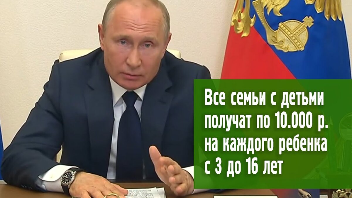 Выплаты 10 тысяч на ребенка до 16 лет. Бурное распространение коронавируса в России вынудило правительство вводить дополнительные меры поддержки семей с детьми. Об этом 11 мая 2020 года заявил Президент Российской Федерации В. В. Путин в своем седьмом обращении к гражданам РФ. Каждый ребенок в возрасте от 3 до 16 лет получит единовременную выплату в размере 10000 рублей. Как получить 10000 рублей на ребенка от 3 до 16 лет? Для получения единовременного пособия воспользуйтесь порталом Госуслуги. Выплата средств начнется с 1 июня 2020 года.