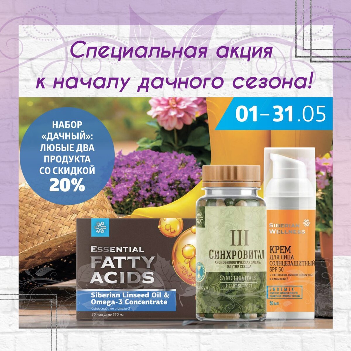 Ты еще не в курсе?! А у Siberian Wellness специальное дачное предложение - выбирай 2 продукта из списка и забирайте оба с невероятной скидкой 20% Бальзам «Уян Номо» – натуральный бальзам с хондроитином и органической серой для защиты суставов, отличное средство при повышенных дачных нагрузках! Подробнее о нем здесь Фитосорбент Pure Life – для очистки организма от опасных токсинов и нормализации обменных процессов. О нем все здесь Кишечный фитосорбент Intestinal Defense – для укрепления иммунитета и нормализации микрофлоры кишечника. Жми «Синхровитал III» – комплексная кардиозащита, которая разработана с учетом биоритмов сердечнососудистой системы. О нем все здесь Восстанавливающий бальзам «Живокост» – натуральное средство для устранения дискомфорта в суставах и мышцах. Солнцезащитный крем для лица SPF 50 – защита лица от солнца нужна не только на море, но и на даче! О нем здесь Солнцезащитное молочко для тела SPF 30 – когда солнце заставит скинуть одежду, защищать нужно будет