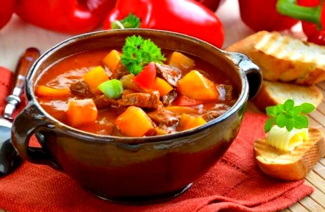 Что понадобиться: Как будем готовить: 1. Нарежем небольшими кусочками мясо, 2*2 см. Добавим растительное масло в кастрюлю и разогреем, в него выложим кусочками мясо. Обжарим их до золотистой корочки. 2. Измельчим чеснок, полукольцами нарежем лук и выложим к мясу. Помешивая обжариваем на среднем огне 2-3 минуты. Добавим половину стакана воды, паприку, соль и тмин. Убавим огонь и накроем кастрюлю крышкой. Оставим тушиться 15-20 минут. Время тушения зависит от мяса, если жесткое - добавьте снова воды и тушите пока оно не станет мягким. 3. Очистим картофель и порежем кубиками, 2*2см. так же поступим с болгарским перцем, вынув сердцевину и нарежем кубиками. 4. Когда мясо стало мягким добавим картофель , томатную пасту, перец чили и болгарский перец. Есть один ньюанс - если хотите чтоб гуляш был острее - чили порежьте кольцами, если хотите чтоб гуляш был просто пикантным - бросьте перец целиком, можно вынуть его перед тем как все будет готово. Добавим стакан воды, перчим, солим и оставляем