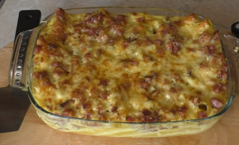 Эту запеканку все называют "Ленивая жена", а я бы назвала ее "Мудрая жена" или "Экономная жена":) Из минимального количества ингредиентов за 30 минут получается просто потрясающее блюдо. Причем в приготовлении используются ингредиенты, которые есть в каждом холодильнике. Прелесть этой запеканки состоит еще и в том, что ингредиенты вы можете добавлять на свое усмотрение. Неизменным остается только наличие макаронных изделий, мясная составляющая и заливка. Хотя вполне можно попробовать приготовить и вегетарианский вариант запеканки. В общем дерзайте! Приступим к приготовлению! В первую очередь смажем форму для запекания растительным маслом. Затем выкладываем на нее макаронные изделия. В моем случае это макароны с отверстиями внутри. В полость макарон попадет соус и они будут невероятно сочными. Теперь приступаем к приготовлению заливки. Вбиваем в емкость 2 яйца, добавляем специи и немного соли. Соли нужно совсем немного, поскольку мы еще будем добавлять ветчину и сыр. Они отдадут свою