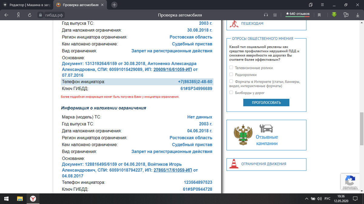 Здравствуйте, друзья! Сегодня расскажу как снять машину с запрета на регистрационные действия, если вы к этому запрету отношения не имеете. Итак, поехали! Есть у меня машина - ваз 2112 2003 года выпуска. Покупалась она в 2017 году в августе месяце. Пробивал машину по всем базам - всё чисто. Поставил на себя на учёт и ездил - горя не знал. Через 2 года захотел продать данный авто и купить что-то подороже (как это всегда бывает). Выставил на всем известные торговые площадки, но никто не звонит. И тут мне пришло в голову пробить ещё раз свою машину на сайте гибдд.ру . Моему удивлению не было предела! Стоит запрет на рег. действия от 06.04.2018 и 30.08.2018. Сразу перешёл на сайт судебных приставов, чтобы посмотреть, на кого стоит запрет и на какую сумму. В итоге стоит 2 долга на самого 1 хозяина авто на общую сумму 40 тысяч рублей. Что же нужно делать, если у вас произошла такая же ситуация? 1. Звоним по номеру Телефона инициатора (это человек, который поставил запрет) и интересуемся к