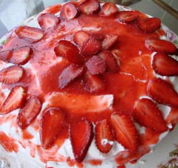В последнее время много тортов заливают желе. Это относится и к магазинной и к домашней выпечке. Мы тоже последуем этому совету и зальем наш торт. Здесь на ваше усмотрение. Хотите, можете взять и ананасовое, и яблочное желе. Но рекомендую все таки использовать такую же по вкусу и цвету желейную жидкость, как клубничную или, в крайне случае, лесные ягоды. Правда, немаловажно использовать специальное быстрозастывающее желе для тортов. Его преимущество в том, что оно не растекается и долго сохраняет свою желейную форму. Итак, желе уже готово – мы его приготовили раньше. Поэтому заливаем им клубничный верх торта. Не забывайте рассчитать время, чтобы желе не застыло.