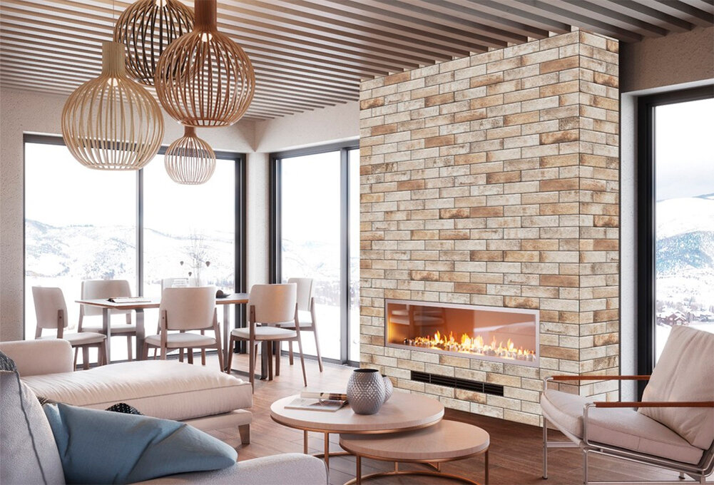 Лучше не оформлять полностью все стены, ограничиться только камином, или фартуком в кухне.