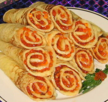 Блины готовы! Подождите, пока они остынут до холодного или, хотя бы, до теплого состояния. Намазываем их икрой, сворачиваем в трубочки и разрезаем наискосок пополам. Это придасть более эстетический вид блюду. Икру можно использовать как красную, так и черную. Начинка в принципе может быть любой - творог, мясо, сыр, грибы с луком, джем, вареная сгущенка… да все, что душа пожелает.Творите! Приятного аппетита!