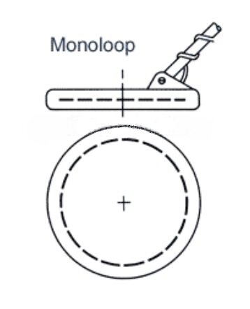 Моно петля - это тип поисковых катушек, в которых несколько нитей провода намотаны в одну петлю по окружности катушки. Схема обнаружения электромагнитного поля катушки имеет коническую форму (простирается выше и ниже обмоток катушки), что требует перекрытия разверток для обеспечения полного охвата земли. Моно катушки могут быть круглой или полуэллиптической конструкции.