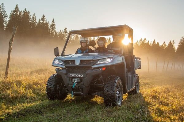 В линейке CFMOTO это наиболее доступный квадроцикл с крышей. Оснащен 800-кубовым двигателем мощностью 63 л.с. при 6000 об/мин, который позволяет развивать скорость 105 км/ч и обладает хорошей тягой на низких оборотах. Грузоподъемность кузова – 230 кг/300 л. Ход передней подвески – 113 мм, а задней – 120 мм. Обе подвески независимые, обеспечивают плавность хода, а также улучшают управляемость и сцепление с поверхностью на неровной дороге. Коробка передач оснащена понижающей передачей. Есть возможность принудительной блокировки дифференциала.