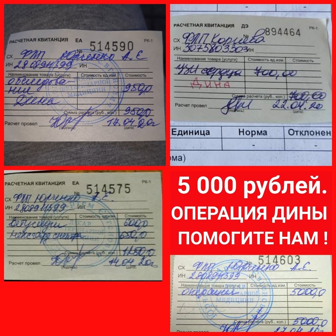 Пока собачка Дина приходит в себя после комплекса операции и ветпроцедур, ее куратор Виктория П. думает, как быть дальше: Собачка Дина: самый сложный этап пройден! У НАС ОСТАЛСЯ ДОЛГ ПО ДИНЕ 3 000. ПОМОГИТЕ ЗАКРЫТЬ ПОЖАЛУЙСТА !!! Общая сумма по чекам 7 900. Благодаря вашей помощи друзья, мы смогли собрать 4 900. Нам осталось еще собрать 3 000. СПАСИБО ВАМ ОГРОМНОЕ ЗА ПОМОЩЬ ДИНОЧКИ !!! Мы сами не потянули, такую сумму(((
