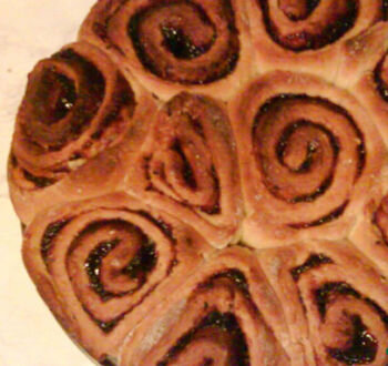 Тесто опять помещаем в большую миску в тёплое и сухое место на 1 час. После чего на плоской деревянной доске, присыпанной мукой, необходимо раскатать тесто скалкой в форме прямоугольника, который необходимо смазать начинкой – джемом или вареньем. Если вы хотите изменить вкус варенья, например, джем кажется вам слишком кислым, то можете его смешать с сахаром. И наоборот, если варенье слишком сладкое в него можно добавить лимонную кислоту на кончике ножа.