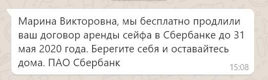 При все моем негативном отношении к Сберу, на днях была просто удивлена. Дело в том, что по одной из сделок мы не можем до сих пор подать документы на регистрацию, ввиду закрытия в МФЦ. Но деньги для расчетов по сделке лежат в ячейке Сбера и плата за пользование капает каждый день, пока мы ждем возможности зарегистрировать сделку. И вот моим клиентам прислали такое СМС: Если у вас появились вопросы или вы хотите помощи в покупке или продаже квартиры, можете смело писать мне Вконтакте