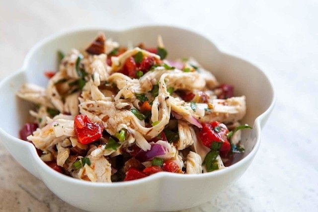 Итого на 100 грамм 85 ккал Б/Ж/У 8.8 / 4.3 / 3 Ингредиенты: Куриная грудка 200 г Свежие грибы 200 г 1 болгарский перец (красный или жёлтый) Половинка красная луковицы Дижонская горчица около 2 ч.л. Натуральный йогурт 2% около 100 мл Оливковое масло - для обжарки 2 ст л Соль, черный перец - по вкусу Приготовление: Филе грудки необходимо помыть, высушить бумажным полотенцем и завернуть в пищевую пленку и слегка отбить скалкой. Посолить и поперчить по вкусу. Затем на разогретой сковороде в оливковом масле обжарить филе, по 5 минут с каждой стороны до готовности. Дать остыть, затем нарезать соломкой. Для пряного вкуса по желанию во время обжарки можно добавить порезанный чеснок или веточку тимьяна. Грибы, выбранные для салата, крупно порезать. Обжарить на оливковом масле до выпаривания жидкости. В конце немного посолить и поперчить. Болгарский перец очистить от семян, и нашинковать крупной соломкой. Луковицу порезать полукольцами и обдать кипятком для мягкости. Для заправки смешать
