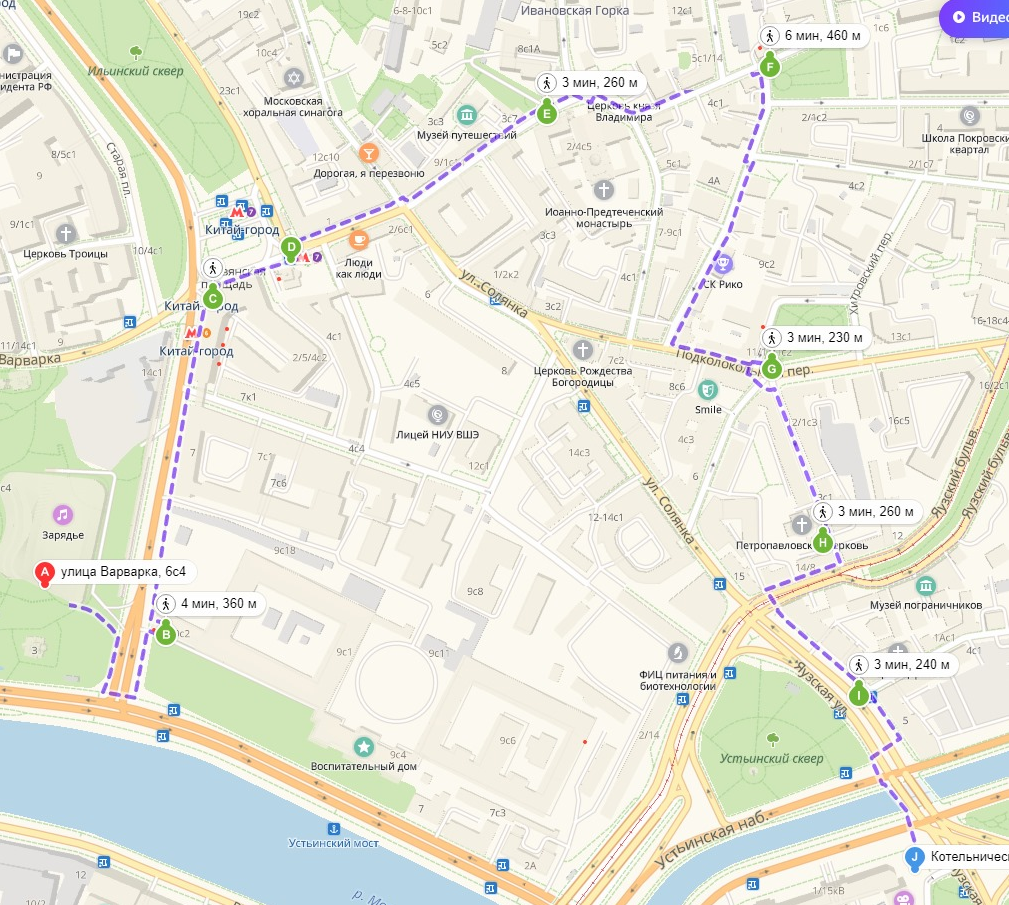 А год и 1 день назад мы тоже «финалили» в Олимпиаде. Это был заключительный финал, в 2020 году мы не планировали участие из-за экзаменов, но, как видно, ничего и не состоялось в связи с пандемией. Это немного радует, если можно так выразиться, так как было грустно смотреть, как другие выбирают маршруты и участвуют, а ты сидишь, и готовишься к экзаменам)) Выбрали мы на этот раз по традиции сложный маршрут и он действительно был ОЧЕНЬ сложным. Такие мудреные задания, что мы с удивлением потом читали ответы на сайте Олимпиады — в реальности нужно гораздо больше времени, чтобы додуматься до такого. Но по времени успели даже чуть раньше (старт в 10:56, финиш в 16:56). Начинали в Парке Зарядье: Карту пришлось разбивать на несколько частей, так как Яндекс не выставляет такое количество точек маршрута за раз. Как видно по картам, маршрут получился очень интересным. Мы открыли для себя много красивых мест Москвы и взяли на заметку — теперь есть куда прогуляться в более спокойной обстановке. Фо